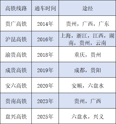 上述4条高铁干线的通车,让贵阳、安顺、六盘水、铜仁、毕节、黔南州、黔东南等7个市(州)迈入高铁时代。仅余的遵义、黔西南两地,分别由渝贵铁路、盘兴高铁串联,实现高铁通达。