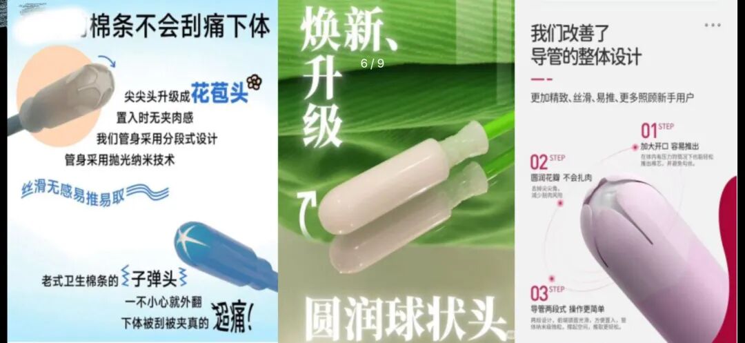 而这些体验感的参差,可能源于个体的差异或使用的熟练程度,也提示着产品在设计与细节打磨上仍有提升空间。不少商家在导管上做了更圆滑的处理,将其变成“花苞头”“圆润球状头”等等。这类棉条是否能更好地解决导管“伤人”的痛点,还要待市场进一步验证。