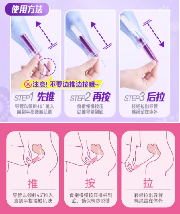 ▲导管式卫生棉条的使用方法(图源:某两款卫生棉条介绍页面)