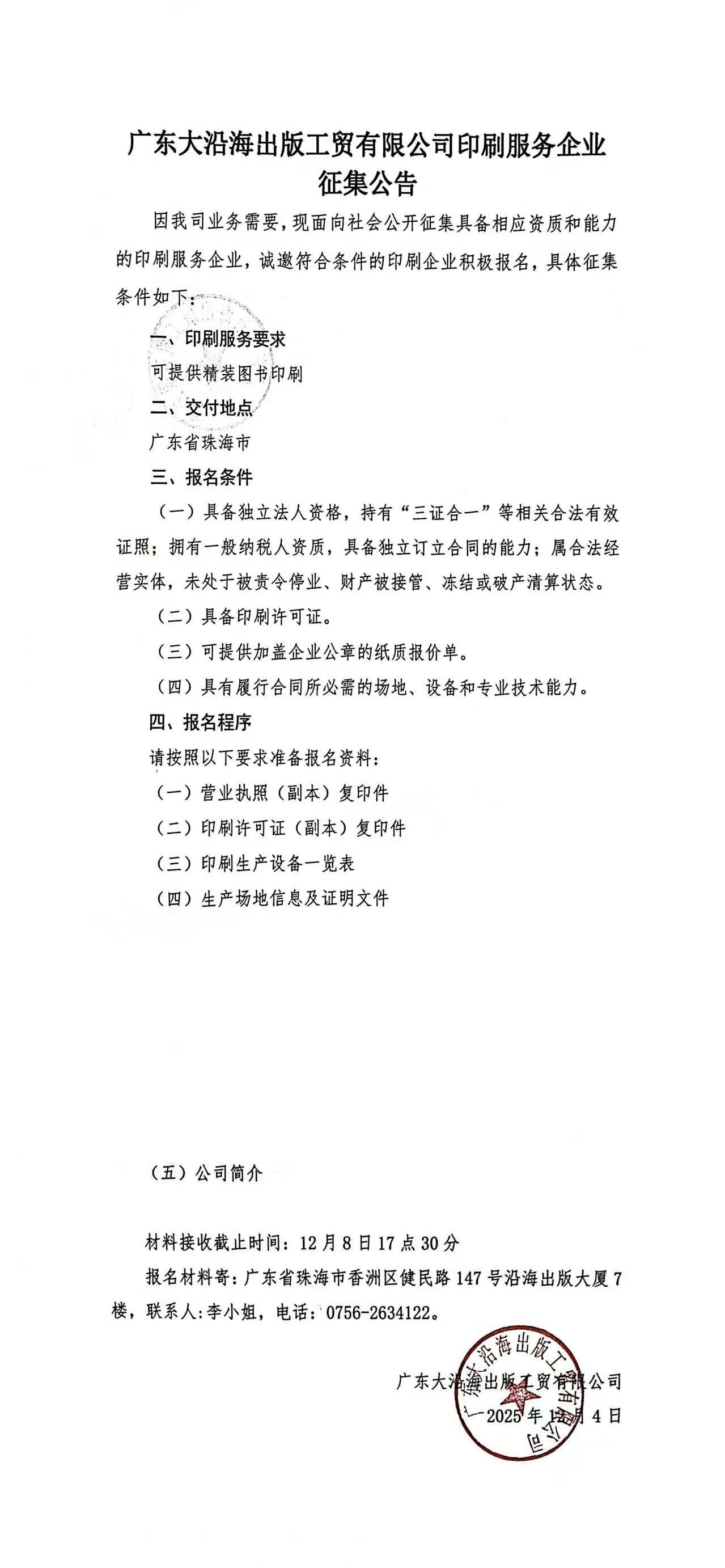 广东大沿海出版工贸有限公司印刷服务企业征集公告