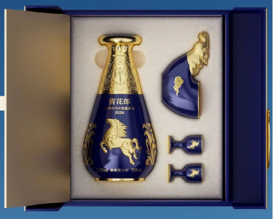 青花郎(丙午马年限量版)挖掘马文化中的祥瑞典故,取“金马玉堂”吉意,将汗血宝马踏云衔芝的祥瑞典故,转化为流动的金色光韵,既彰显“一马当先铸大业”的进取精神,亦传递“金鞍焕彩入玉堂”的美好祝愿。
