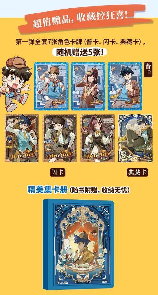 图书附赠精美集卡册,并随机搭配5张侦探卡牌(全系列共7张,含普卡、闪卡、典藏卡三种类型)。卡牌印有角色专属技能介绍,扫码还可累积积分兑换周边产品。据家长反馈,此类设计使孩子主动与同学开展卡牌互换活动,将阅读转化为“趣味社交体验”,有效降低了阅读引导难度。