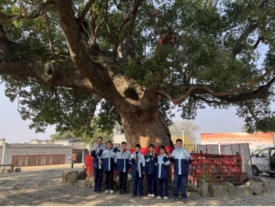 阳光淌过巨树冠盖,在石砖与泥土间洒下斑驳的光影。一群身穿蓝色校服的小朋友,叽叽喳喳地围着巨树。他们是隆平学校的五年级学生,此刻正以一场热闹的游学,打破了古树的静谧,也让四下里顿时漾开勃勃生机。跃动的朝气与沉静的苍古,反倒相映成趣。