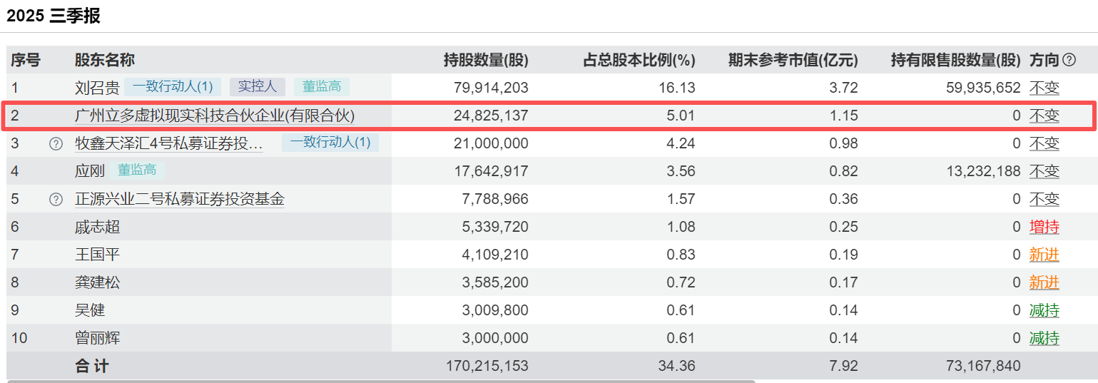 截至2025年三季报,立多虚拟仍持有5.01%股份,位列公司第二大股东,且未发生减持。