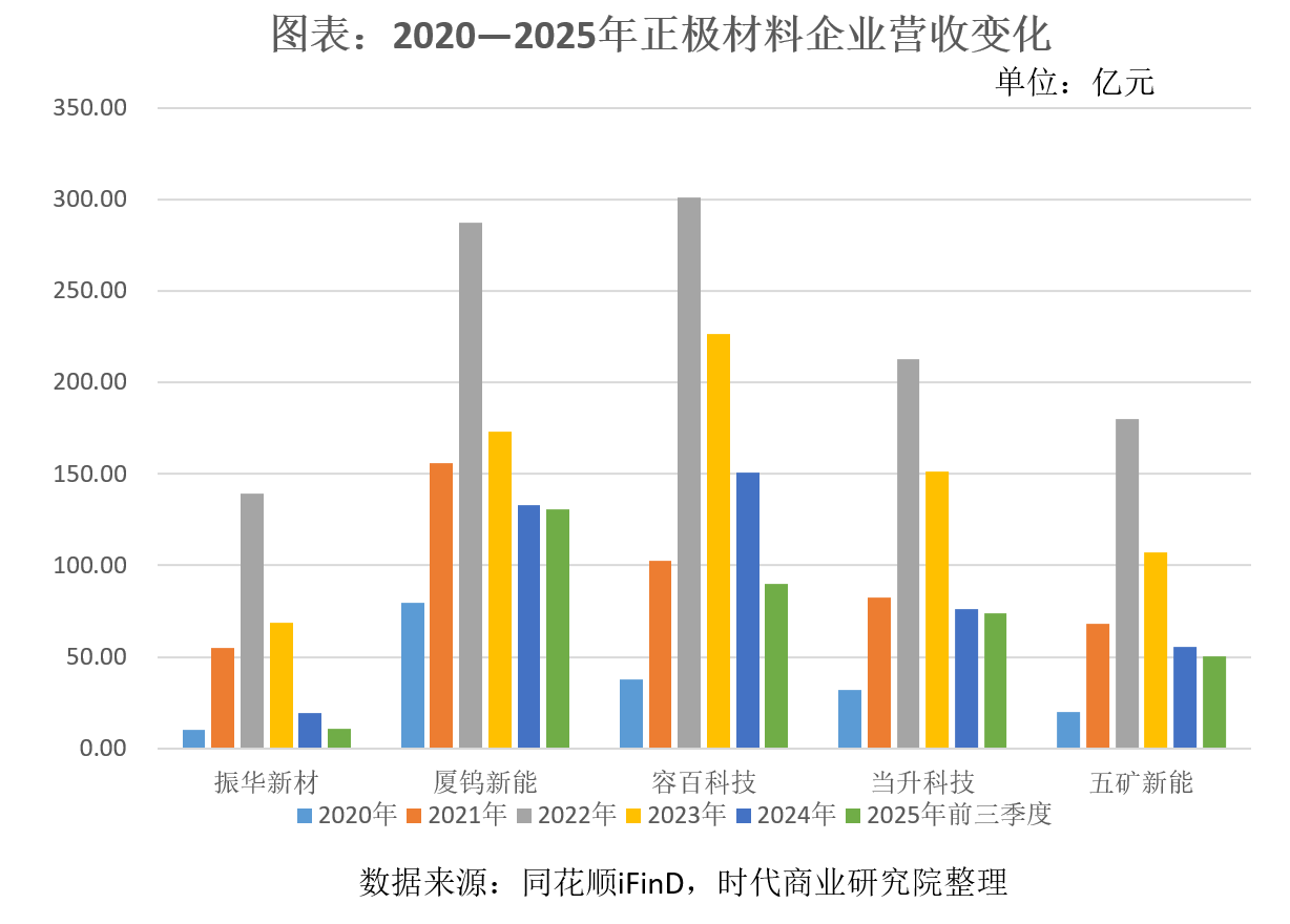 2022—2024年期间,振华新材的营收下滑幅度超过另外四家同行;而2025年前三季度,厦钨新能(688778.SH)、当升科技(300073.SZ)、五矿新能(688779.SH)均已实现业绩反弹,营收分别同比增长29.80%、33.92%、33.96%。