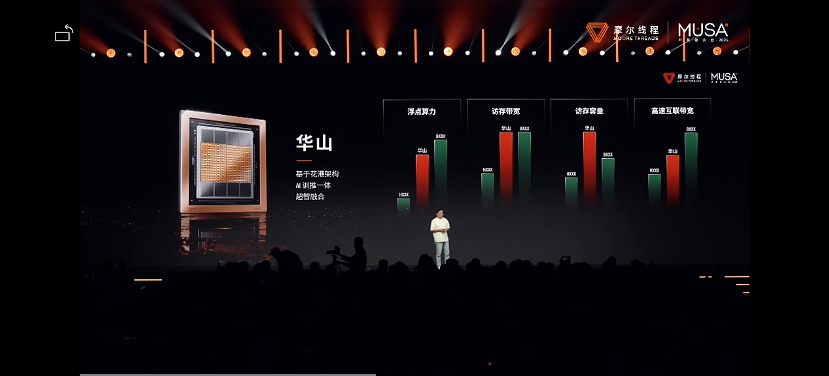 业界惯将摩尔线程比作“中国的英伟达”,在发布会上,张建中也未避讳提到与英伟达的对比。以最新发布的“华山”芯片为例,张建中表示,“华山”的访存带宽、浮点算力和高速互联带宽三个指标能力介于英伟达的最新架构Blackwell和上一代架构Hopper之间,而访存容量则高于二者。