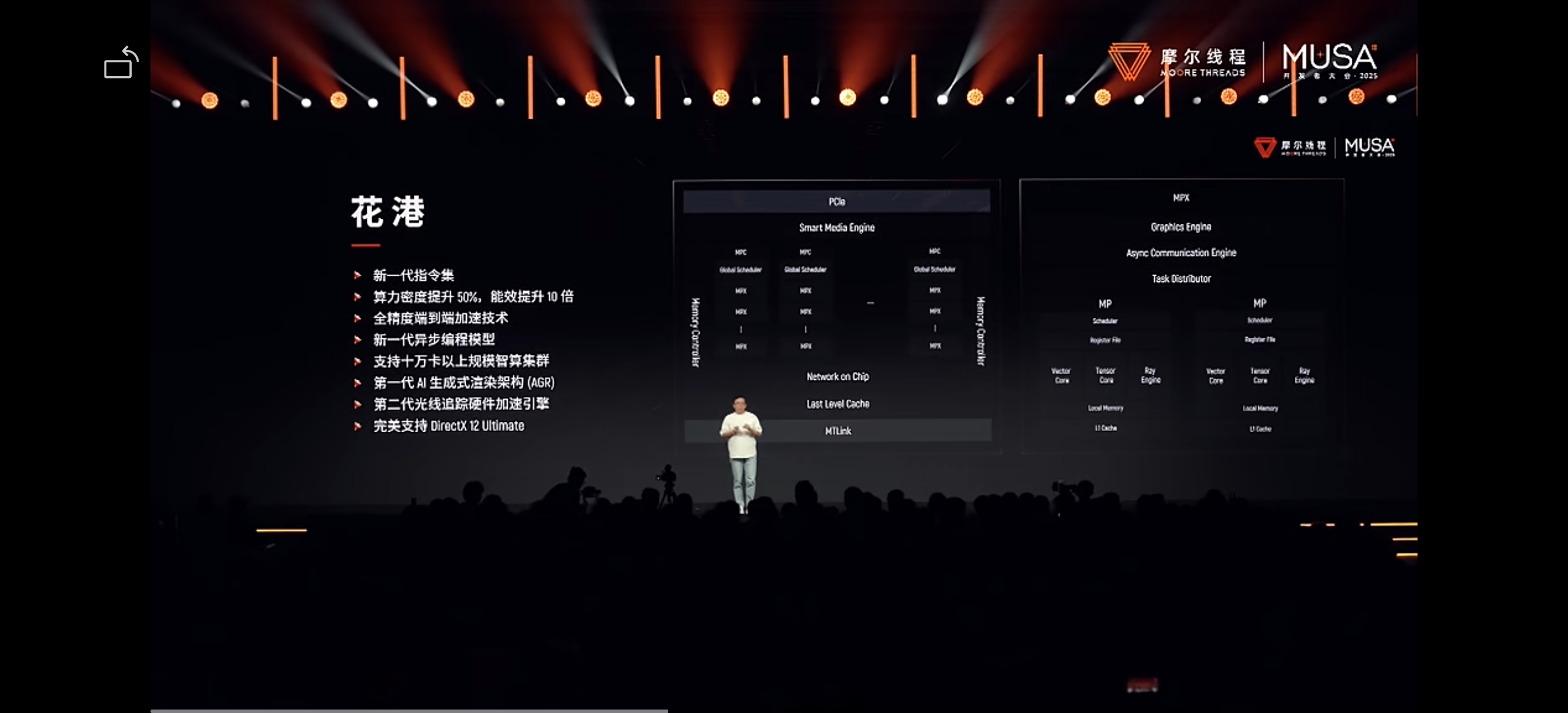 从发布节奏来看,摩尔线程基本保持一年一迭代的节奏。从2022年的苏堤开始,到春晓、曲院、平湖,此次发布会上,摩尔线程发布了新一代全功能GPU架构“花港”。