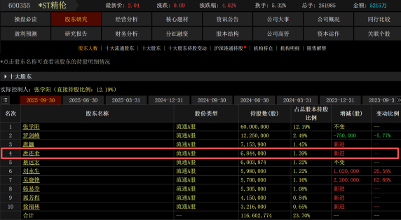 *ST精伦(600355.SH)在上周走出了4个跌停板后,12月22日涨停,报2.05元/股,市值达10.09亿元。