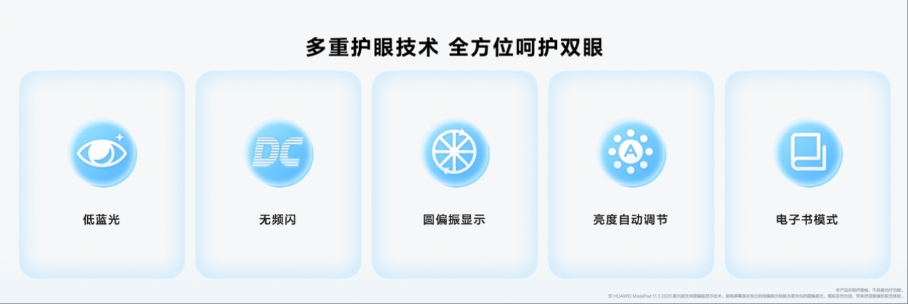 屏幕方面,华为MatePad 11.5柔光版搭载护眼云晰柔光屏,新增纳米磁控光学镀膜技术,屏幕反射率降低60%,能有效消除99%的环境干扰光,带来类纸般的舒适观感与书写体验。同时,新品引入“类自然光护眼显示”,也是华为平板首次搭载圆偏振光技术,模拟自然光的光学特性,减少对眼睛的定向刺激,从而有效降低视觉疲劳程度。