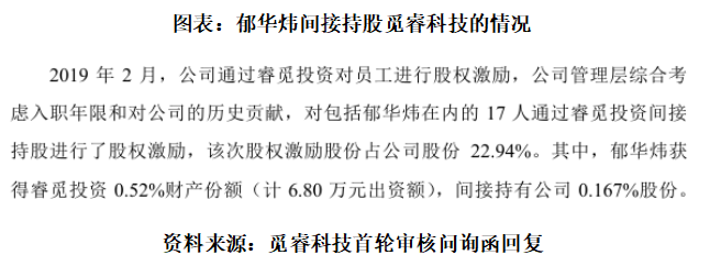 值得关注的是,首轮审核问询函回复文件显示,2019年,郁华炜通过觅睿科技的员工持股平台宁波梅山保税港区睿觅投资合伙企业(以下简称“睿觅投资”)间接持有觅睿科技0.167%的股份。2020年6月郁华炜从觅睿科技离职,任职于华宇智讯,但觅睿科技仍为其保留了对睿觅投资的股权激励份额。