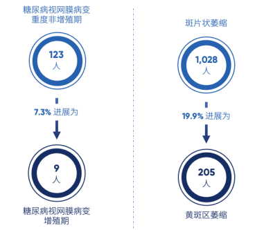 连续进行眼底“年检”有助于及时发现眼底异常的进展,《蓝皮书》显示,初次检查发现糖尿病视网膜病变重度非增殖期的体检者,有7.3%在末次检查时进展为增殖期;初次检查发现斑片状萎缩的体检者,有19.9%在末次进展为黄斑区萎缩,这两项眼底异常均较2024版《蓝皮书》进展明显加快,需要引起重视。