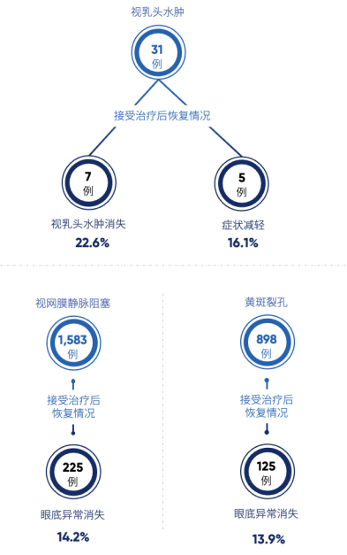 此外,通过对比发现部分体检者的眼底异常经过干预和治疗后得到了有效改善:在初次检出的31例视乳头水肿体检者中,末次检查时7例症状消失、5例症状减轻;检出视网膜静脉阻塞和黄斑裂孔的体检者在接受治疗后眼底异常消失率分别为14.2%和13.9%。