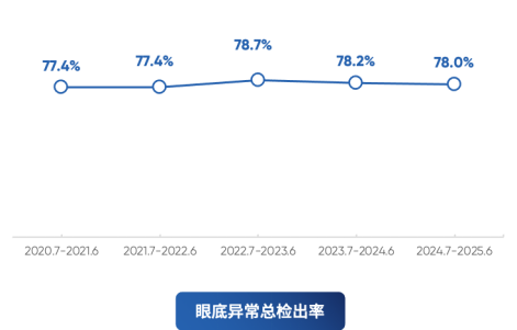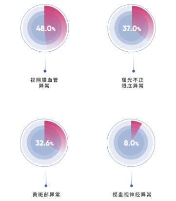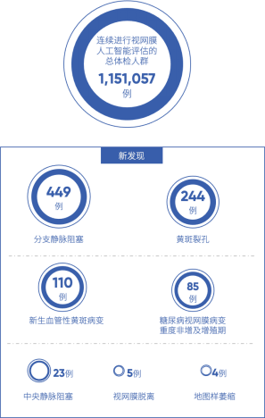 在眼底重要异常结果方面,即发生于视网膜的严重异常需要立即到医院确诊或排除可能引起严重视力损伤的病变,累计发现28,562例,检出率为0.4%,有效预警了失明风险。