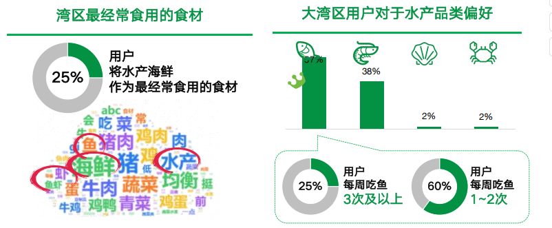 叮咚买菜发布的《湾区餐桌趋势报告》指出,大湾区人均水产品消费量(40~60公斤/年)大约是全国平均水平(城镇居民人均消费水产品17.4公斤)的2-4倍。其用户调研数据也显示,大湾区用户中,约60%的用户每周吃鱼,四分之一的消费者每周吃鱼次数达到三次及以上。