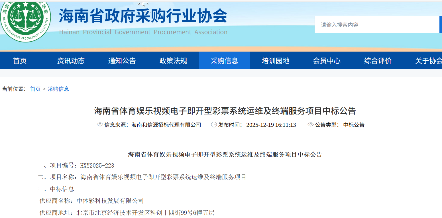 2025年12月19日,海南省政府采购行业协会网站发布的《海南省体育娱乐视频电子即开型彩票系统运维及终端服务项目中标公告》显示,中体彩是唯一中标方。根据招标文件,该招标的服务年限为3年。