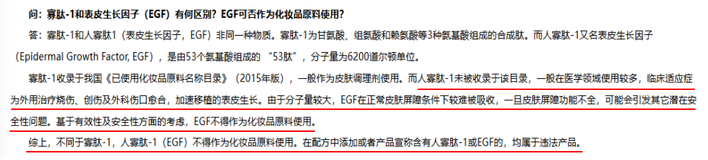 2019年1月,国家药品监督管理局发布了《化妆品监督管理常见问题解答(—) 》,给化妆品生产经营又划出—条红线。《化妆品监督管理常见问题解答 (—) 》 明确表示 :表皮生长因子(EGF)又名“人寡肽-1”, 未被收录在《已使用化妆品原料名称目录》(2015 年版)中, —般在医学领域使用较多,临床适应症为外用治疗烧伤、创伤及外科伤口愈合,加速移植的表皮生长。基于有效性及安全性方面的考虑,表皮生长因子 ( EGF)不得作为化妆品原料使用。在配方中添加或者产品宣称含有人寡肽-1 或 EGF 的,均属于违法产品。