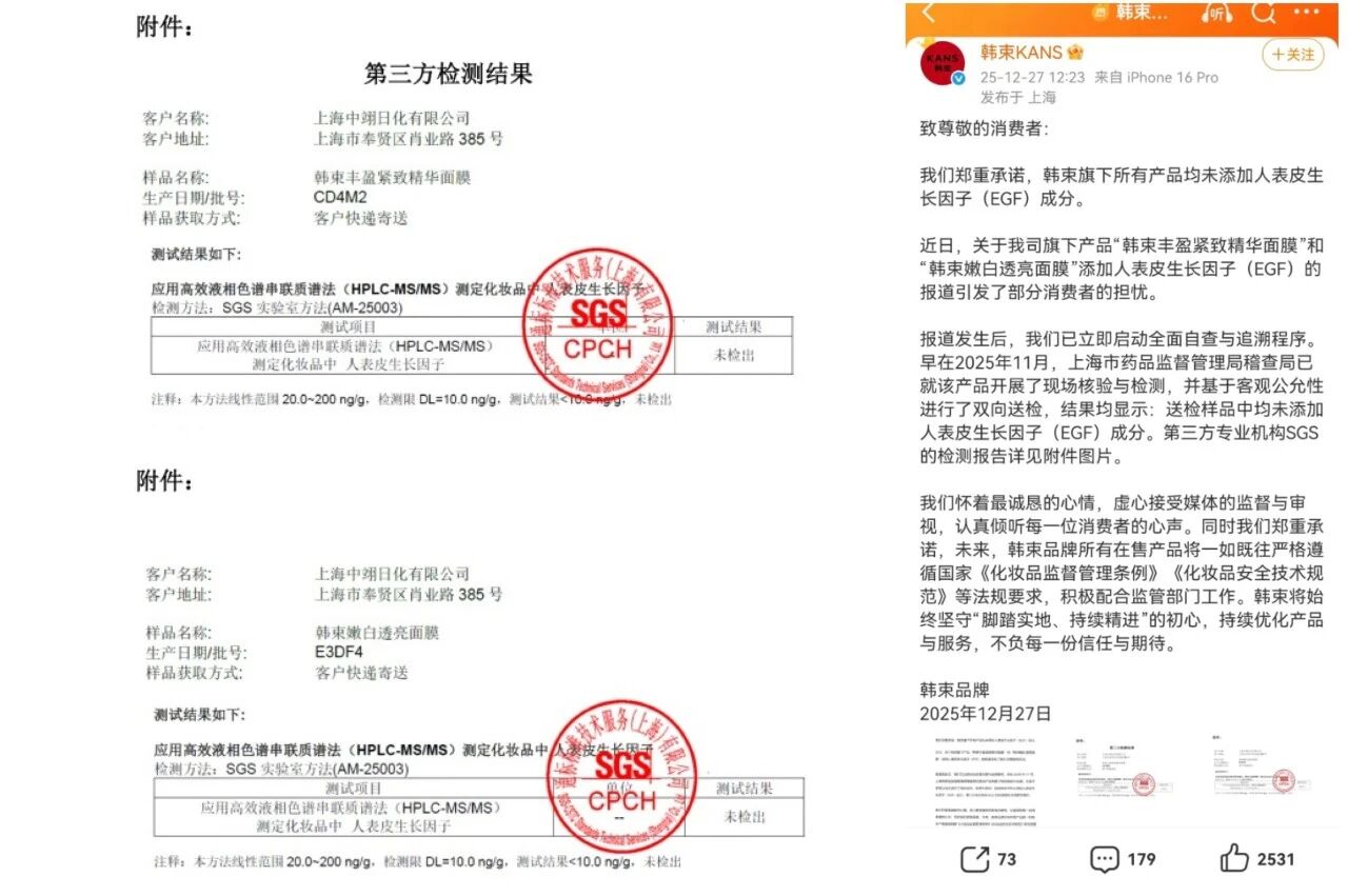 韩束对此快速回应。12月27日,韩束方面公开了两款涉事面膜的检测报告,结果均显示未检出表皮生长因子(EGF)。