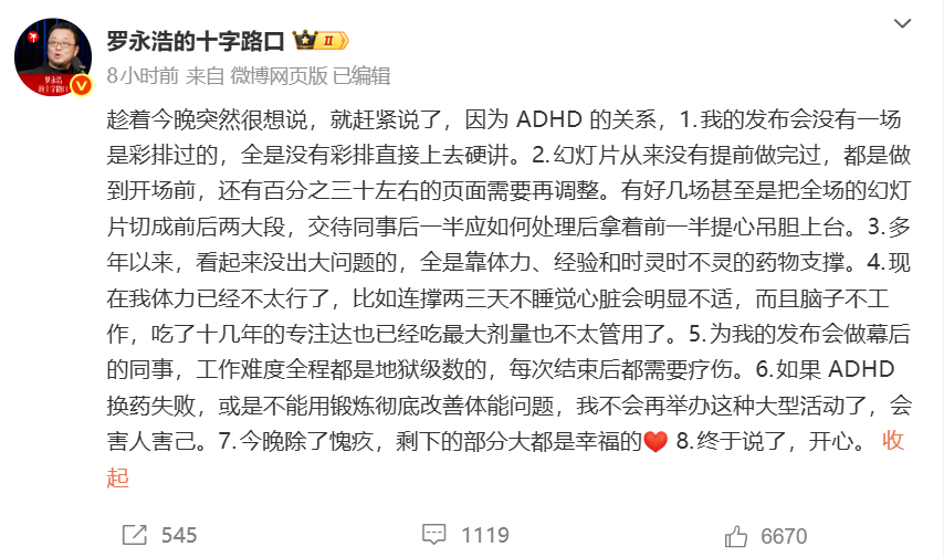 罗永浩表示,多年以来,看起来没出大问题的,全是靠体力、经验和时灵时不灵的药物支撑。现在体力已经不太行了,吃了十几年的专注达也已经吃最大剂量也不太管用了。如果ADHD换药失败,或是不能用锻炼彻底改善体能问题,他就不会再举办这种大型活动了。