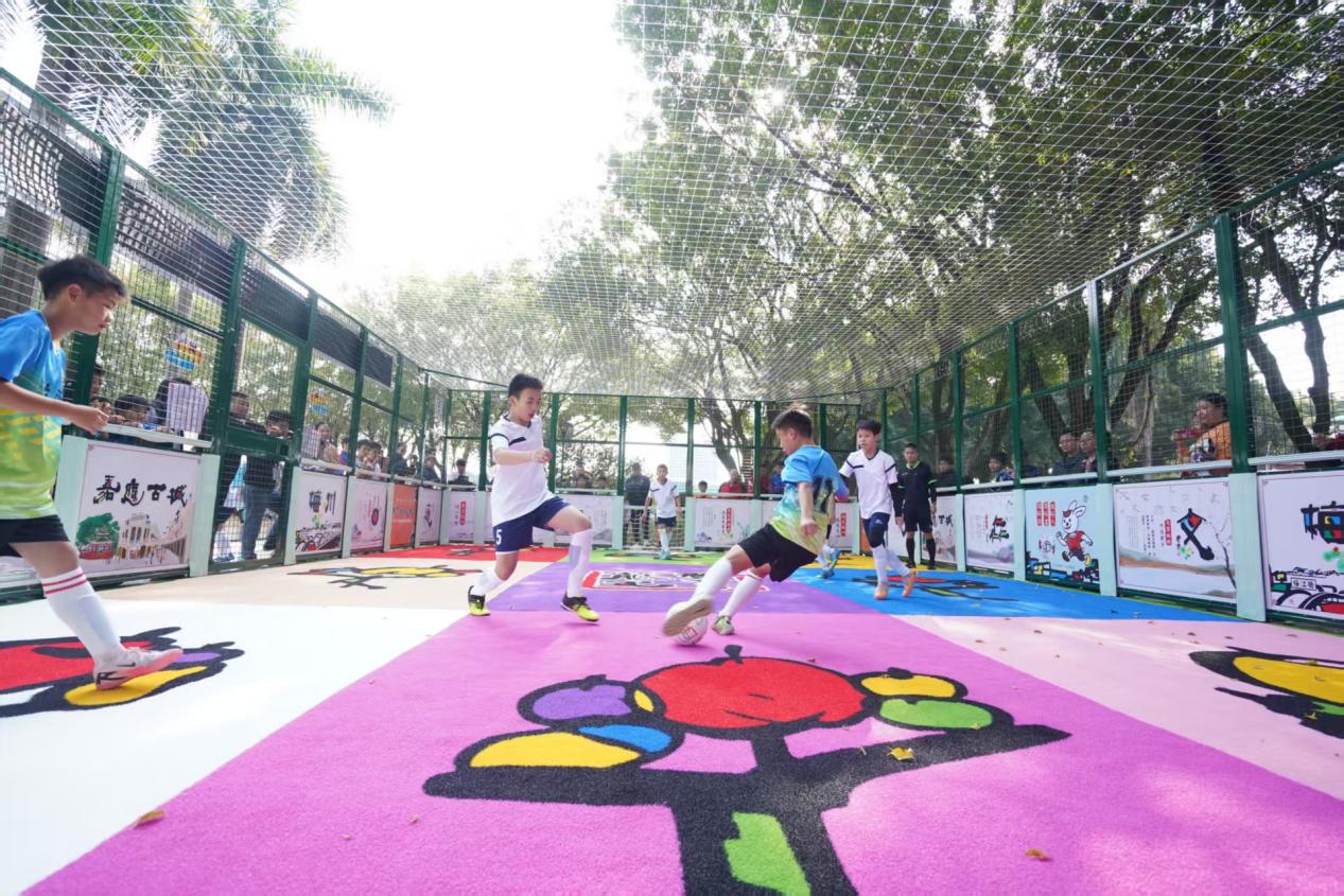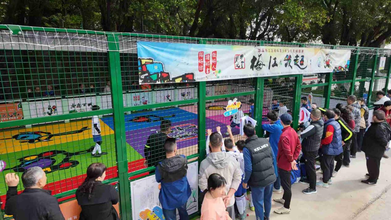 据了解,“梅江笼超”联赛场地还创新打造“彩书笼式足球”场,这一由中国彩书创始人、广东省工艺美术大师何柏俊打造的特色项目,将国学经典、客家文化与足球运动深度融合,构建起“德育、美育、体育”三育并举的成长课堂,拓展了体育教育的内涵与形式。比赛场地采用8米宽、12米长、3米高的全封闭笼式球场,草皮上镶嵌着九宫格彩书“乐”字矩阵,围网挡板印刻《四书五经》等国学经典,让小球员在奔跑竞技中穿梭于字里行间,成为流动的国学载体。