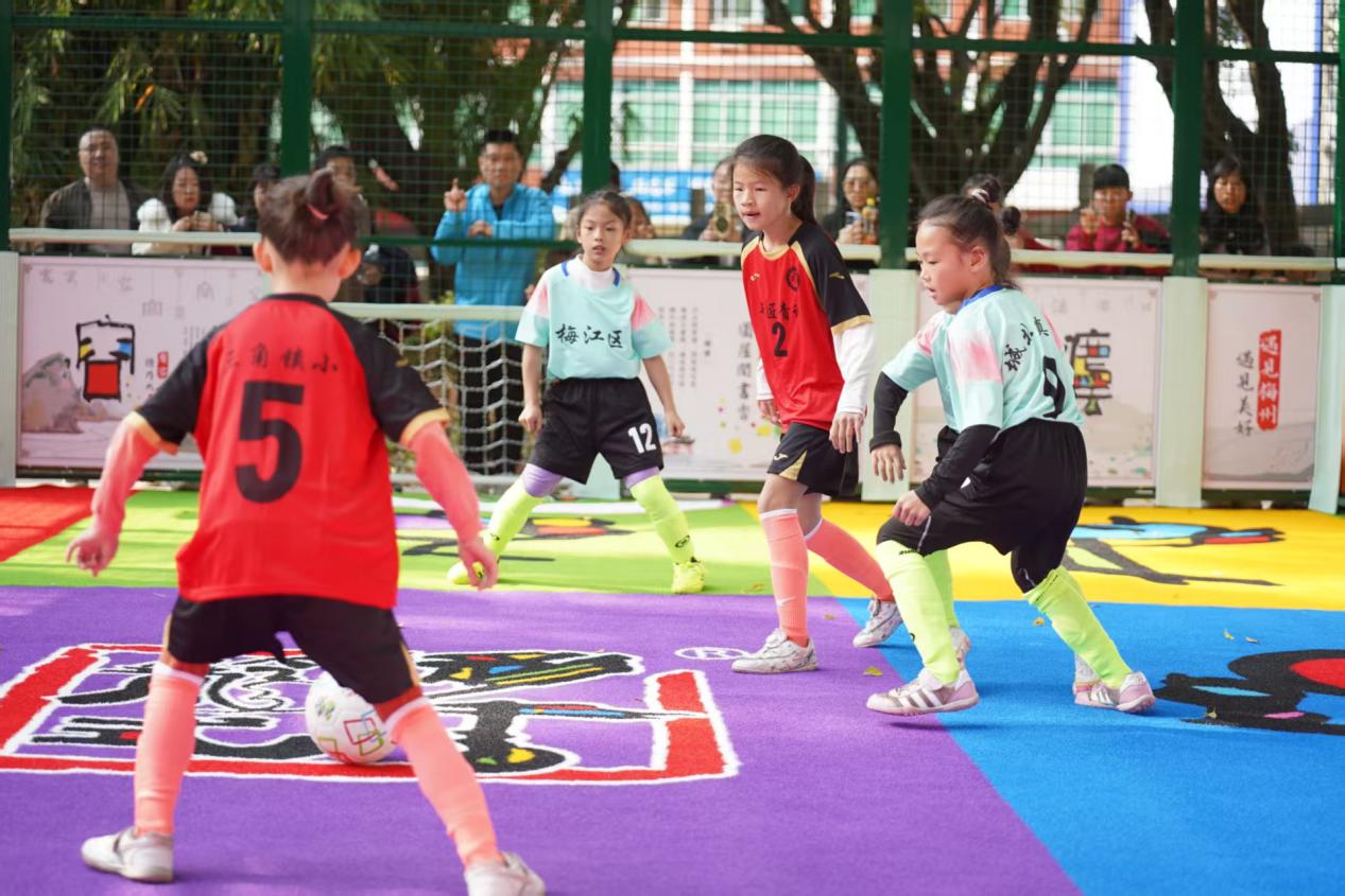 作为梅州市梅江区首次举办的青少年笼式足球专项赛事,“梅江笼超”规模空前。全区37所中小学校组建了116支参赛队伍,805名足球小将分为小学一至二年级、三至四年级、五至六年级及初中组四个年龄组别,涵盖男女多个组别展开角逐。赛事采用“分组单循环+单场淘汰制”,小组前两名晋级八强,后续通过半决赛、决赛决出各组别冠亚季军,紧凑的赛制让每一场比赛都充满竞技张力和观赏乐趣。