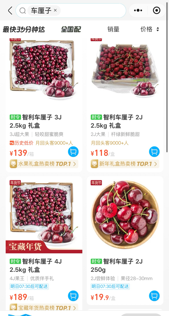 品种方面,随着1月智利车厘子海运进入高峰期,市场主流品种也从早期的桑提娜逐步切换为拉宾斯。后者外观鲜红、果肉硬脆、耐储存,更符合偏好酸甜口感的消费者需求。除了拉宾斯,永辉还上线了科迪亚、瑞吉娜、雷尼尔等多个品类。