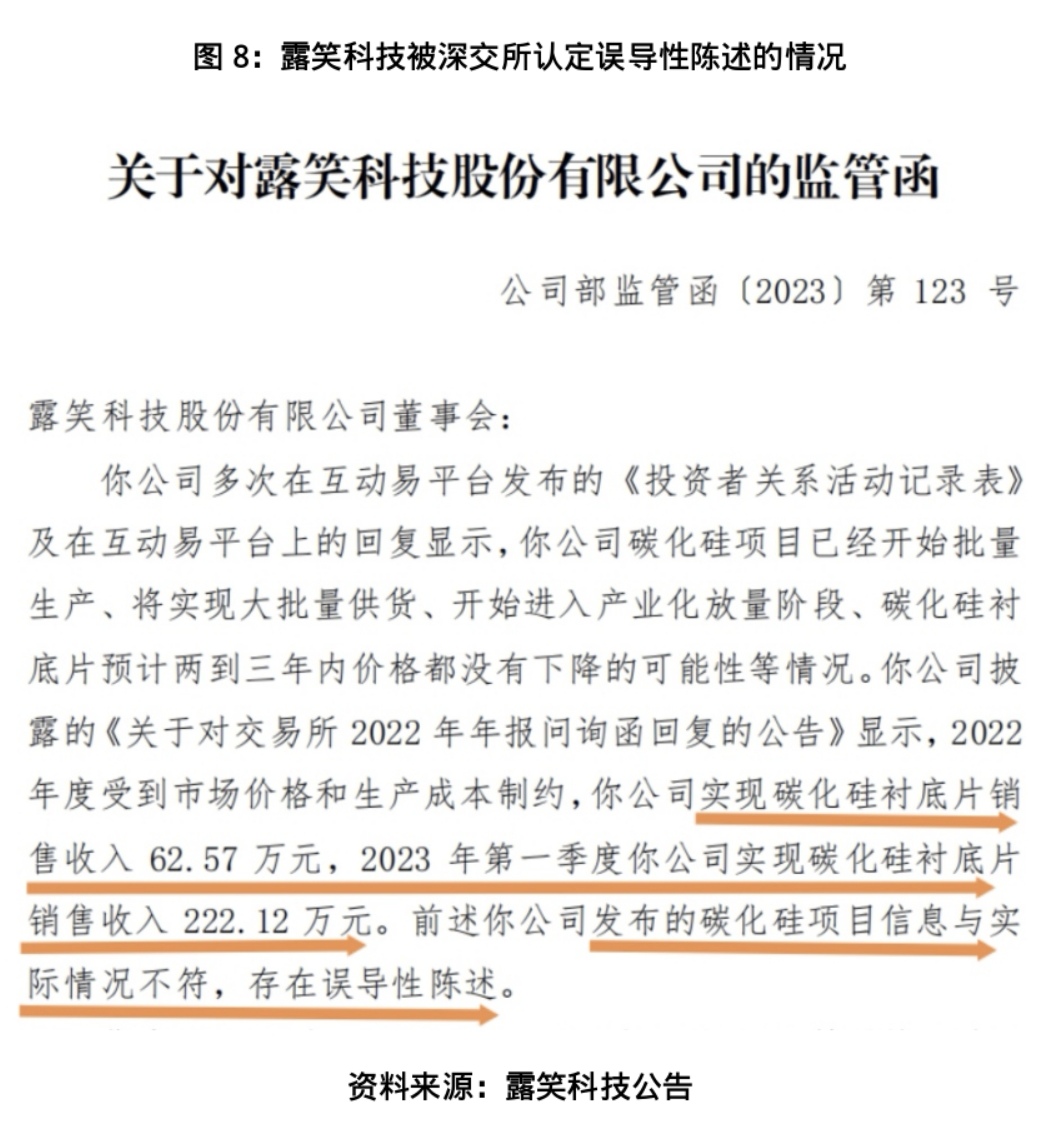 项目进度滞后与信息披露内容的矛盾更引发监管关注。2023年8月,深交所正式下发监管函,明确认定露笑科技在碳化硅项目进展披露上存在误导性陈述,违反信息披露真实性原则。