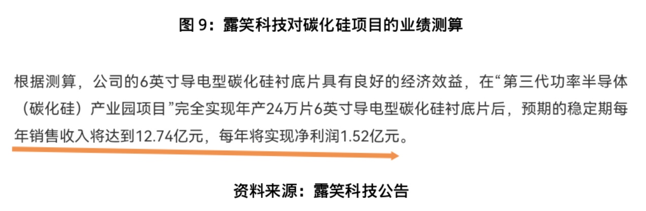 经营数据更是戳破了此前的宣传泡沫:2022年,露笑科技碳化硅衬底片销售收入仅为62.57万元,2023年一季度销售收入也仅为222.12万元。这与当初“12个月投产,稳定期每年销售收入达12.74亿元,每年将实现净利润1.52亿元”的表述形成天壤之别。更耐人寻味的是,在此后的历年年度报告中,露笑科技便再未公开披露碳化硅业务的具体营收数据,相关业务的真实经营状况与进展愈发成谜。