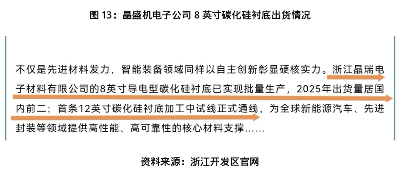 据浙江开发区官网信息,晶盛机电(300316.SZ)子公司浙江晶瑞电子材料有限公司的8英寸导电型碳化硅衬底已实现批量生产,2025年出货量居国内前二;首条12英寸碳化硅衬底加工中试线正式通线。此外,2025年6月20日,浙江省投资项目在线审批监管平台发布了浙江晶瑞电子材料有限公司年产60万片8英寸碳化硅衬底片切磨抛产线项目的备案公示。不难看出,行业集体向大尺寸升级的趋势愈发清晰。