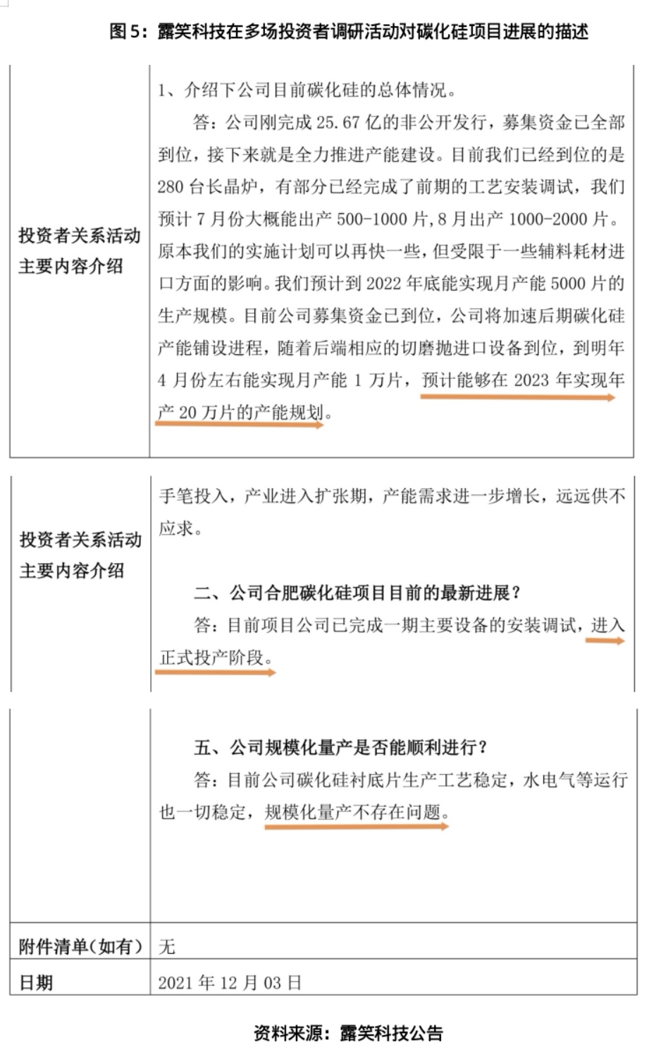 为支撑这一宏大规划,露笑科技2021年定向增发募资25.67亿元,其中19.40亿元明确投向合肥碳化硅项目。2021年以来,露笑科技更是在多场投资者调研活动中持续释放积极信号,频频提及“产能扩大”“正式投产”“规模化量产不存在问题”,不断推高市场对其转型成功的预期。