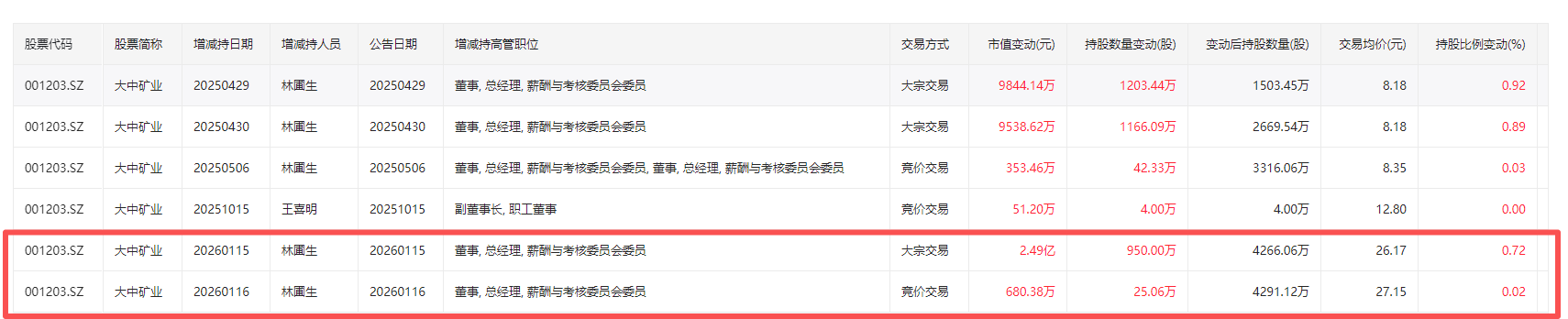 据交易平台相关信息,大中矿业董事、总经理林圃生已于近三个交易日(2026年1月15日至19日),通过大宗交易和集中竞价的方式连续三次增持公司股票,共计增持公司股份1533.08万股。