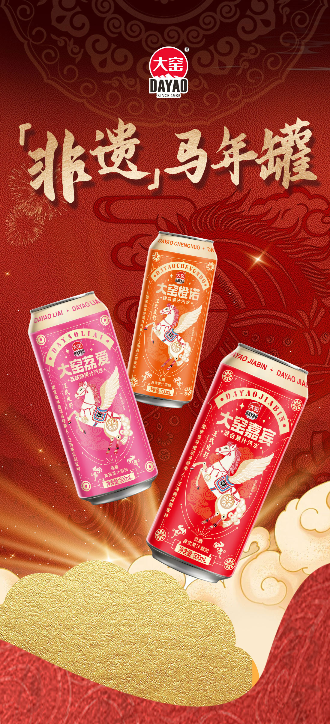 此次,大窑特邀“汪氏皮影”传承人亲自操刀,推出马年新春限定包装,精准聚焦春节场景,将非遗文化与年俗进行了深度绑定,将皮影艺术从荧幕“搬”上了餐桌。这款非遗联名罐包含大窑嘉宾、大窑橙诺、大窑荔爱三款经典果汁汽水,真实果汁添加,一口气感十足。在保留产品“劲爽大汽”核心特点的基础上,遵循“纹必有意,意必吉祥”的传统纹样逻辑,将汪氏皮影的标志性技艺与吉祥寓意深度融入产品包装,设计细节处处体现匠心。