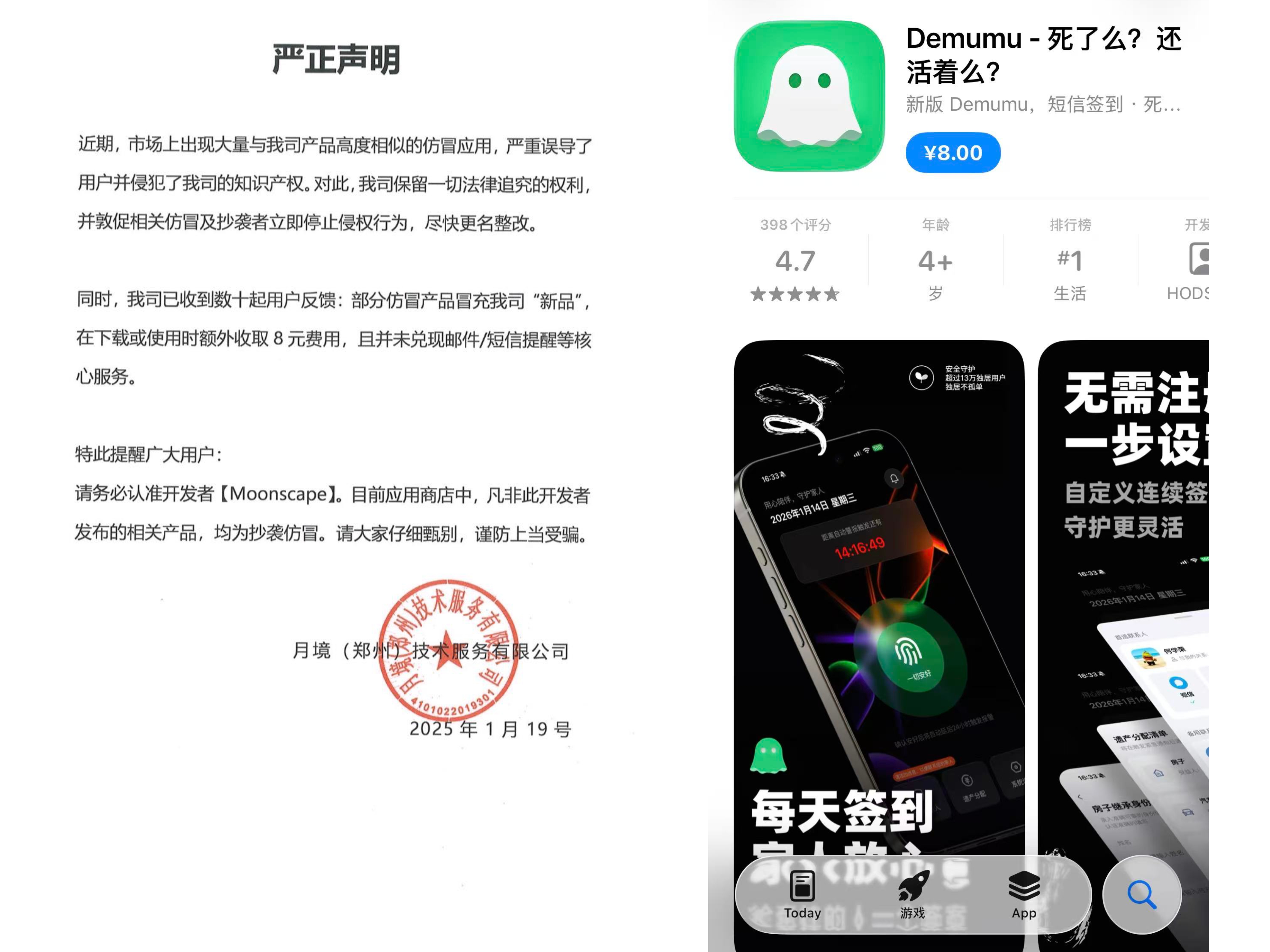 吕功琛提醒,用户要认准开发商“Moonscape”,强调“保留一切法律手段,对侵权行为采取措施”。他说,公司申请相关专利、申请Logo等事项也都在推进。