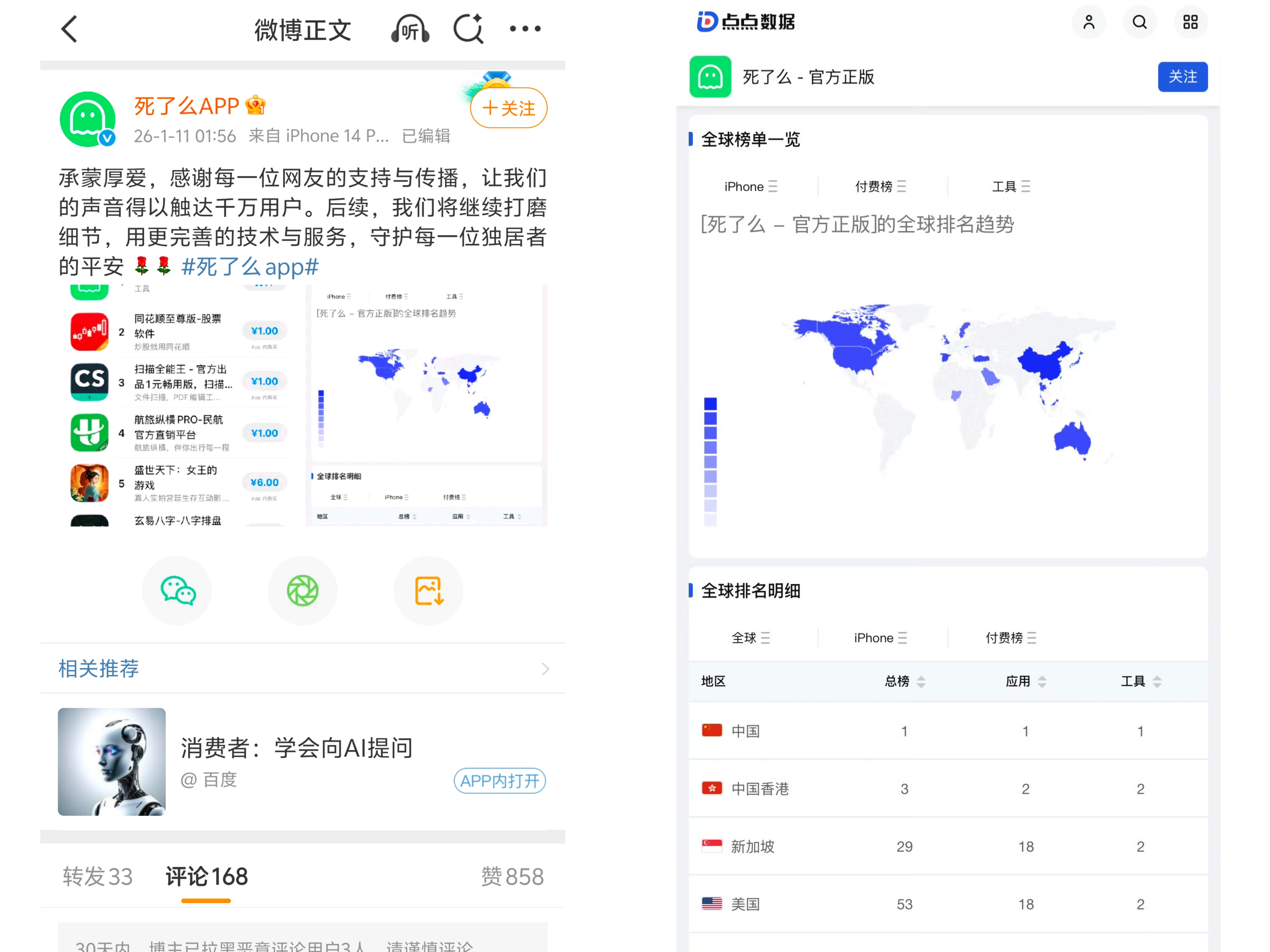 可参考的是,1月11日,他在微博发布感谢消息,感谢每一位网友的支持与传播,“让我们的声音得以触及千万用户。”配图则是“死了么”App在全球排名的趋势,其中显示中国第1,新加坡排名29,美国、泰国、澳大利亚、新加坡均有上榜。