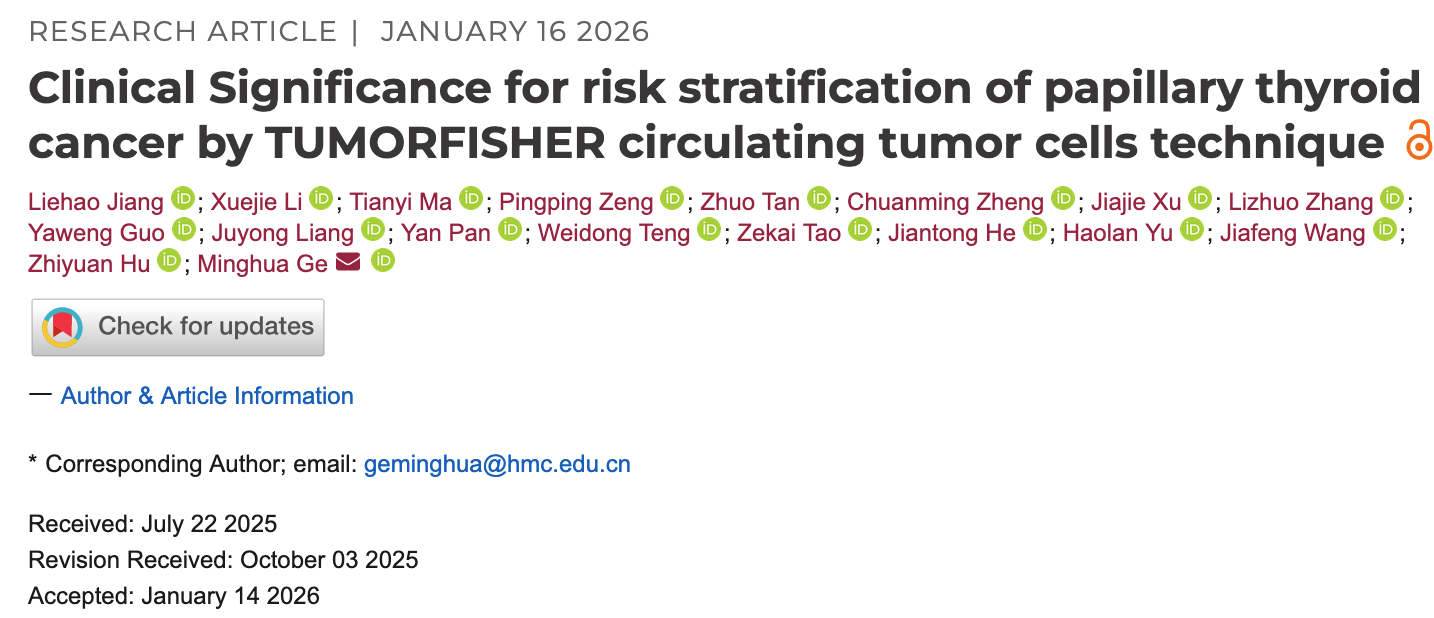 近日,浙江省人民医院葛明华团队,在国际权威期刊《Clinical Cancer Research》上发表了一项重磅研究,给广大甲状腺癌患者带来好消息。他们利用由中科院自主研发的TUMORFISHER®CTC检测技术,只需要抽取患者4毫升静脉血,检测血液中的“循环肿瘤细胞”(CTC),就能在手术前精准判断病情的凶险程度。