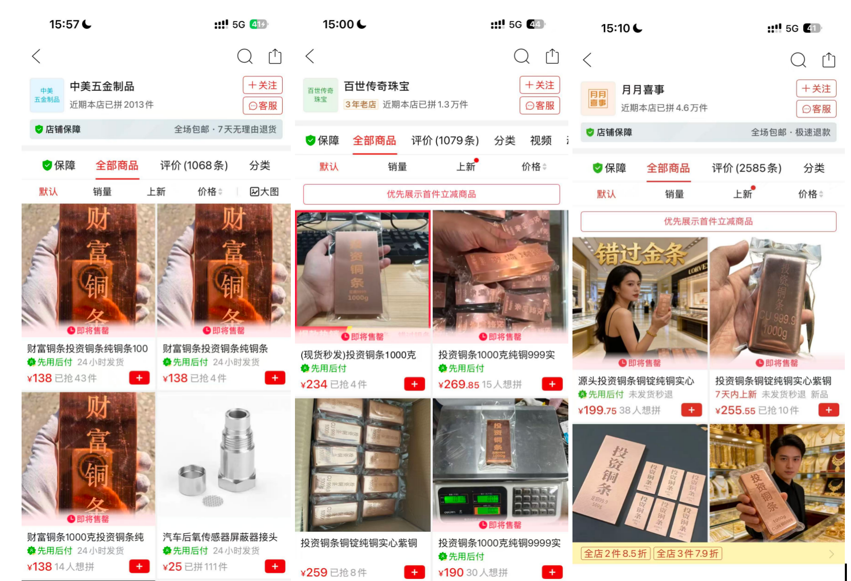 “投资铜条”现身淘宝、闲鱼、拼多多