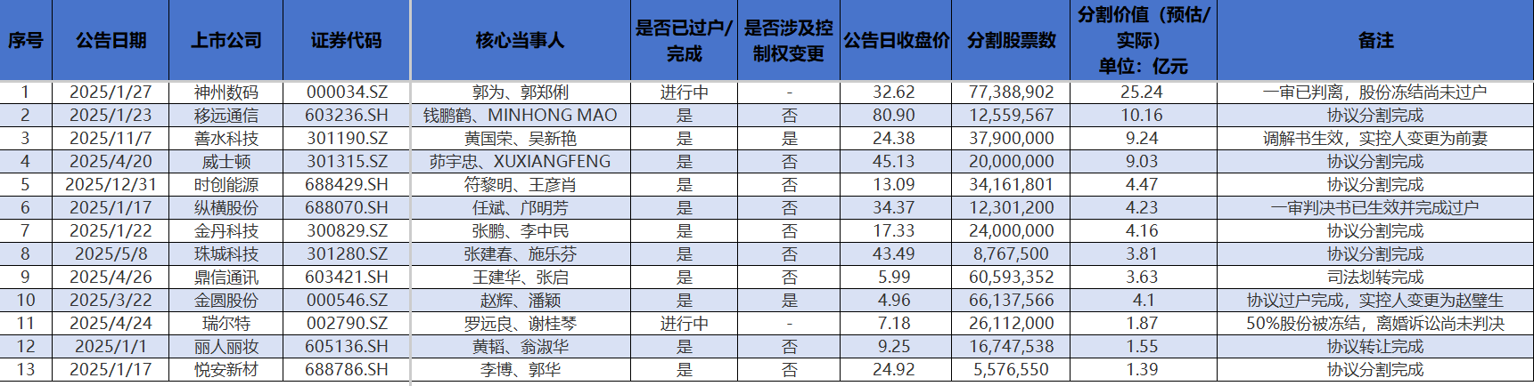截至2026年1月23日,上述13起上市公司实控人离婚案例中,仍有神州数码(000034.SZ)和瑞尔特(002790.SZ)两家公司相关股份分割尚在推进中。