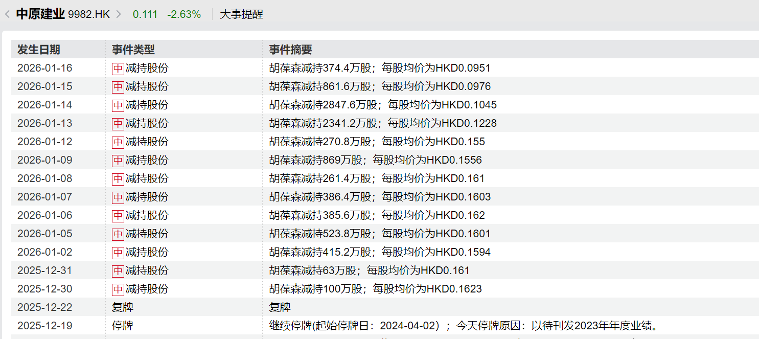 不过,值得注意的是,在中原建业恢复交易的一个多月来,胡葆森却进行多次减持。时代周报记者查询港交所公告获悉,2025年12月30日至2026年1月16日,胡葆森共计减持13次,合计减持超9700万股,占公司总股本的2.51%,套现超1000万港元。