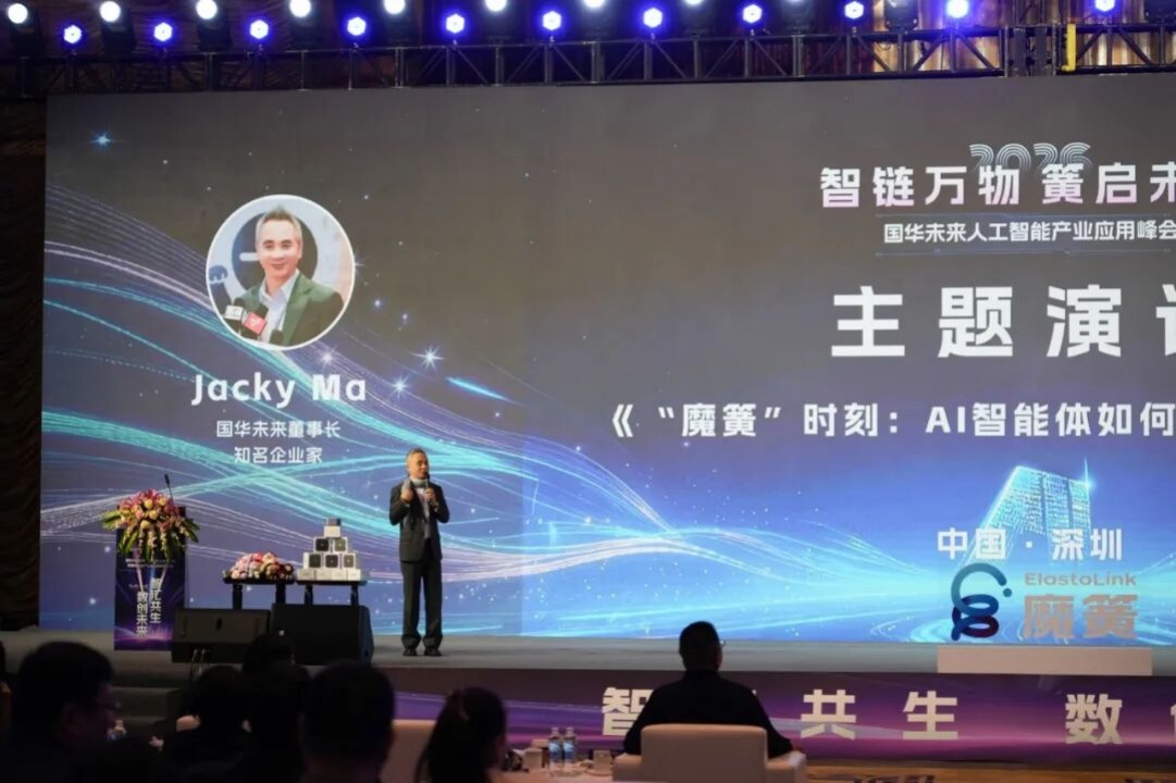 在酷炫的“魔簧”宣传片后,国华未来科技集团董事长马向东登台,正式发布 《国华未来:以AI智能体构建产业互联网新生态》 战略。他系统展示了以“魔簧”为核心,从技术层、平台层到应用层的全景生态蓝图,并现场演示了 “魔簧智能会议助手” 与 “智能面试小屋” ,让与会者亲身感受了AI从“可用”到“好用”的沉浸式体验。