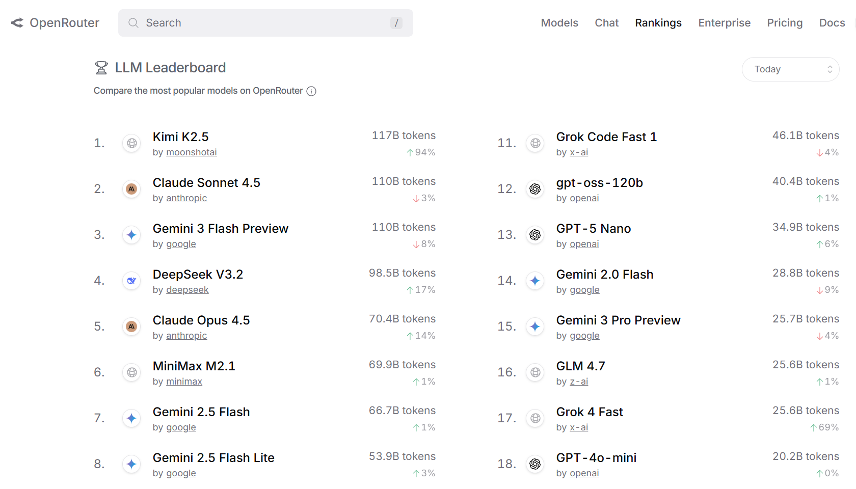 据大模型聚合平台OpenRouter数据,目前,Kimi K2.5已超过谷歌的Gemini 3 Flash Preview、Anthropic的Claude Sonnet 4.5以及Deepseek的DeepSeek V3.2等模型排名第一。