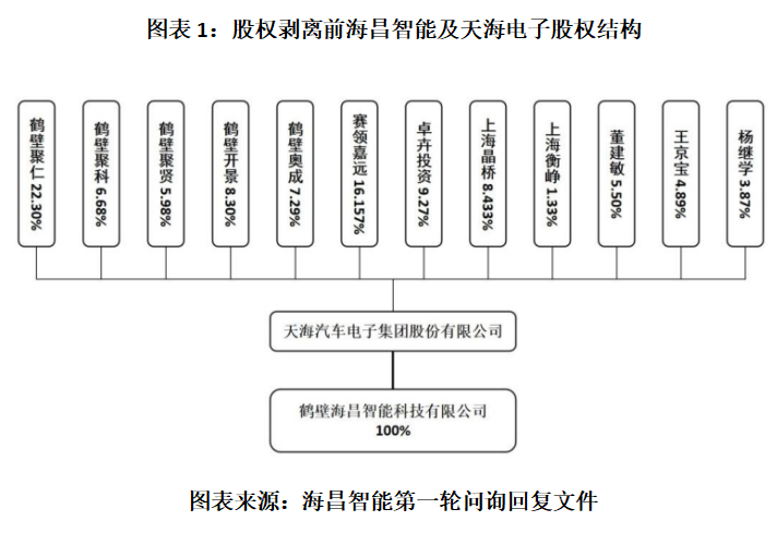 第一轮问询回复文件显示,从股权结构上看,包括鹤壁聚仁在内的12名股东曾控制天海电子100%的股权,并间接控制海昌智能100%的股权。