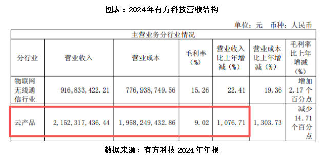 这一点从财报数据中可清晰窥见:2024年年报显示,当年有方科技云产品业务毛利率仅为9.02%,较2023年的23.73%大幅下滑14.71个百分点,不仅降幅惊人,更显著低于同期物联网无线通信业务15.26%的毛利率水平,云业务的盈利短板已初步显现。