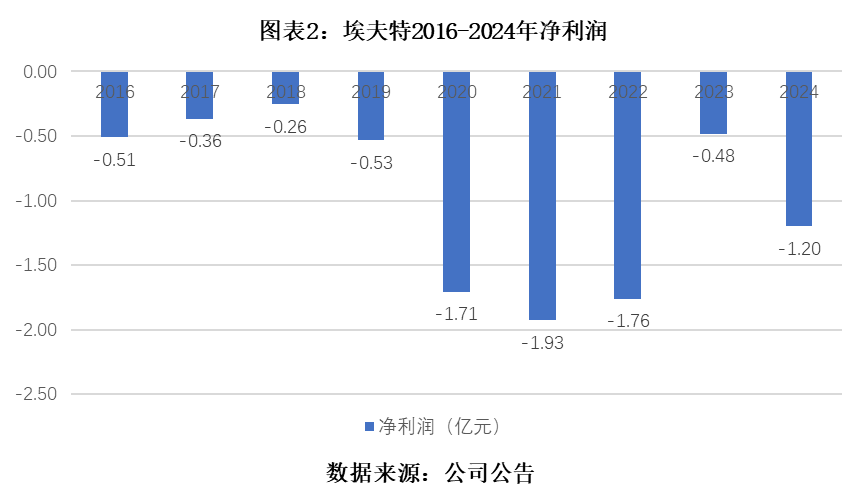 然而,令市场担忧的是,埃夫特已经历了长达十年的持续性亏损。自2016年以来,该公司归母净利润始终为负,进入了一个漫长的亏损周期。2025年的预亏公告,更是将亏损额推高至4.5亿—5.5亿元,同比扩大186%—250%。上市6年,埃夫特仍未摆脱“U”的后缀,深陷亏损泥潭。