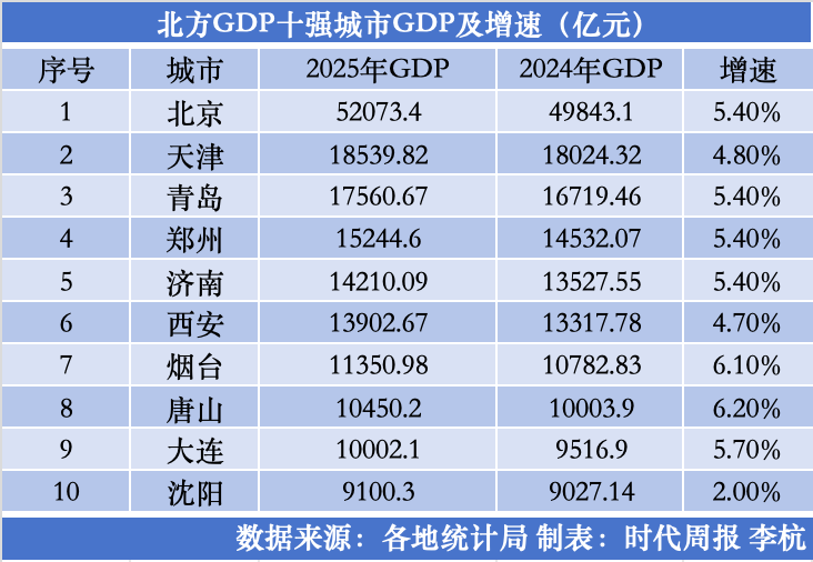 北京以52073.4亿元领跑,天津守住“北方第二城”位置,青岛紧随其后。北方十强城市中,除北京、天津两个直辖市外,山东有3座、辽宁有2座,河南、陕西、河北各有1座。