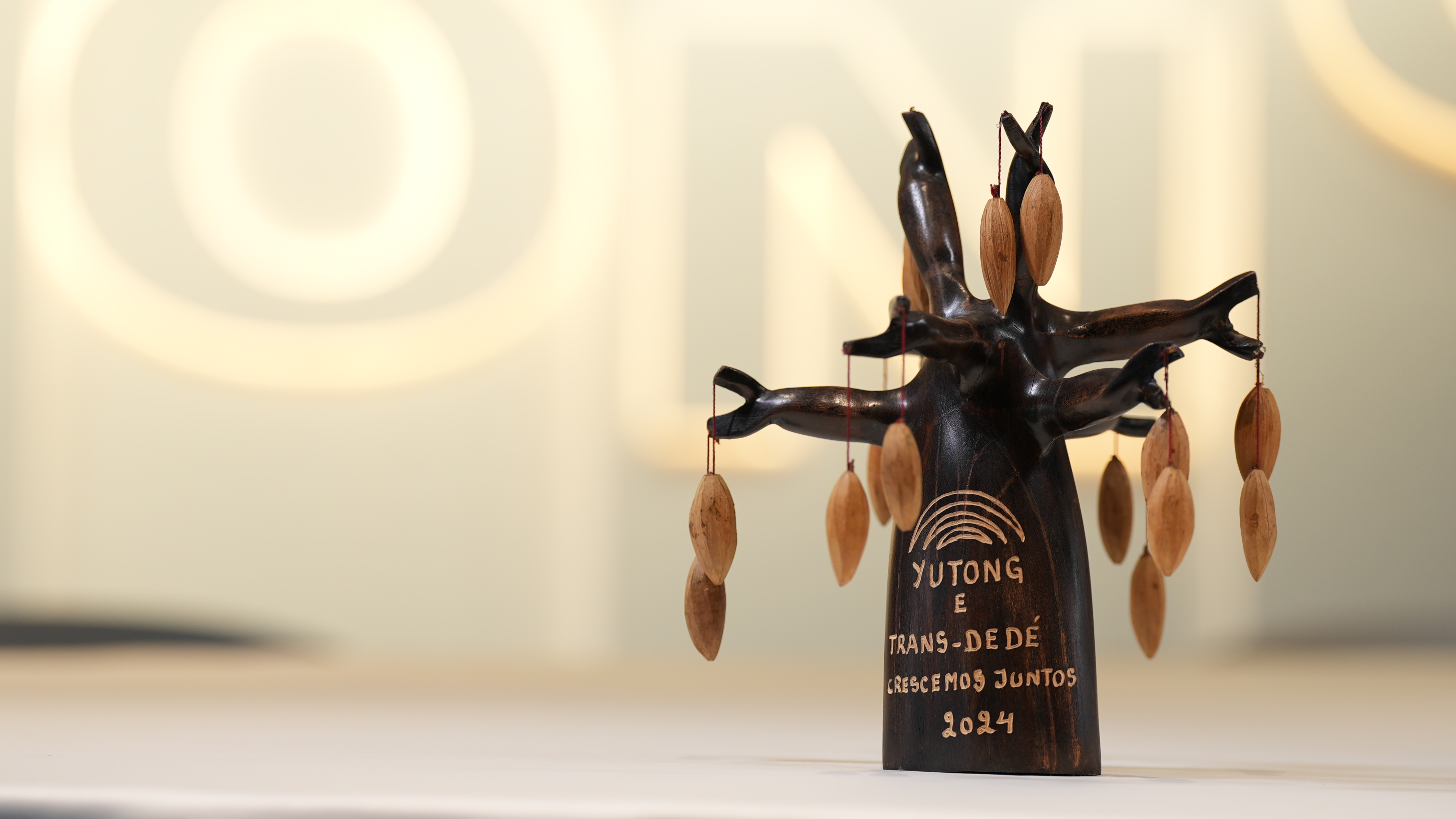 后来,客户把这尊木雕赠送给我们,这上面挂着象征着友谊与和平的橄榄核,树身上刻着我们与客户公司的名称,还有一行葡萄牙语“Crescemos Juntos”,意思是共同成长。他说,猴面包树,能在最干旱的环境里屹立千年,是“生命之树”。这份礼物背后是客户对我们的三重认可,认可了宇通车的可靠品质,认可了团队扎根当地永不言弃的诚意,更认可了宇通作为一个品牌带来的持久生命力。现在宇通客车不光驰骋在全球各个市场,还在16个国家建立了KD工厂,实现了本地化生产,并将售后网络覆盖全球。