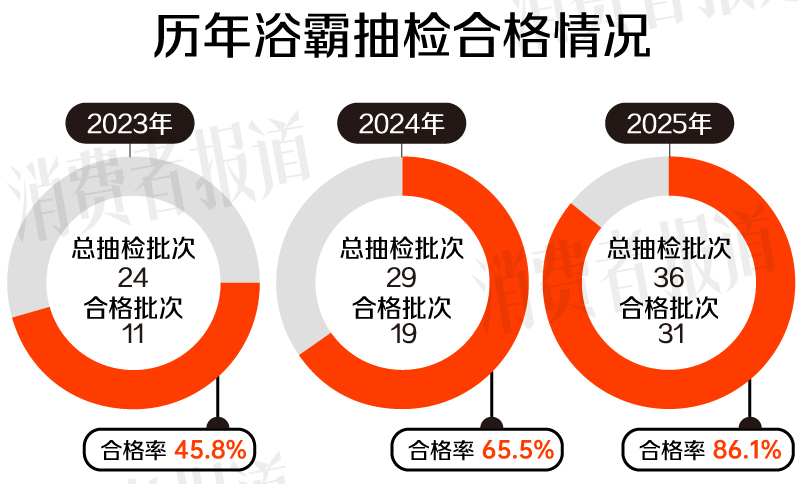 分年份来看,浴霸抽检的合格率呈逐年递增趋势,说明产品质量合格情况正在改善。其中2023年、2024年的合格率分别为45.8%、65.5%,而2025年浴霸抽检合格率飙升至86.1%,抽检批次和合格批次较往年也有明显提升。