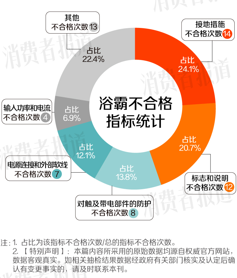 值得注意的是,接地措施是浴霸抽检中出现不合格批次最多的指标,抽检发现14批次因该指标不合格,占比超过24%。