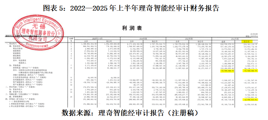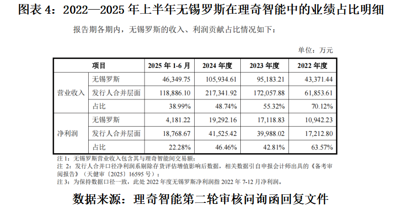 由此测算,2022—2025年上半年,理奇智能的营收总额为57.01亿元,其中51.01%来自无锡罗斯;理奇智能的净利润总额为11.75亿元,其中43.86%来自无锡罗斯。