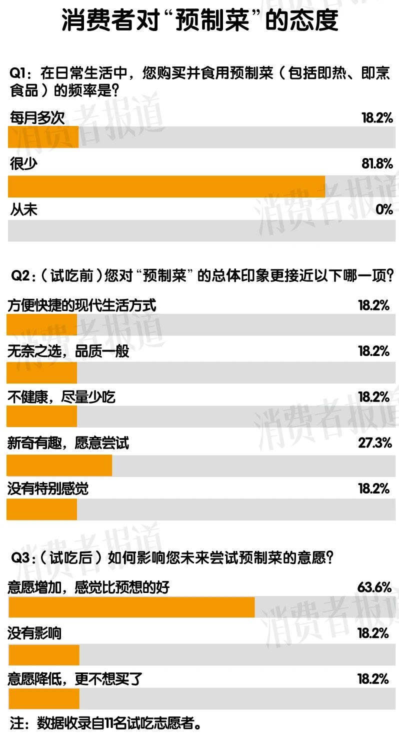 本次测评中,《消费者报道》对11名参与测评的消费者展开了关于预制菜的问卷调查。结果显示,试吃前,高达81.2%的消费者表示日常生活中“很少”购买或食用预制菜(含即热、即烹食品),但无人表示“从未”接触,可见预制菜已普遍进入生活。