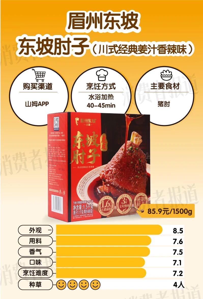 妙音咪子表示,“肘子炖得极为软糯,筷子轻轻一扒即可轻松分离。川式的姜汁香辣味很有特色,有效化解了肥腻感。就冲‘发财就手’的好意头,它就该上年夜饭的桌”;麦麦认为,“很大的肘子,肉很多,卤味十足”;张无技认为,“这个辣味挺正的,肉也到火候了,如果皮能厚一点,软一点,就很可口了”;橙子评价,“吃起来不蘸酱没味道,蘸酱有味道了但姜味太重”。