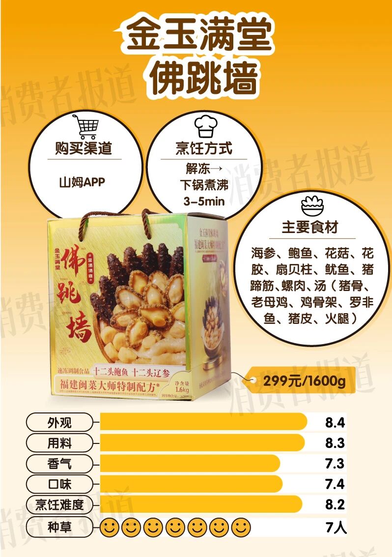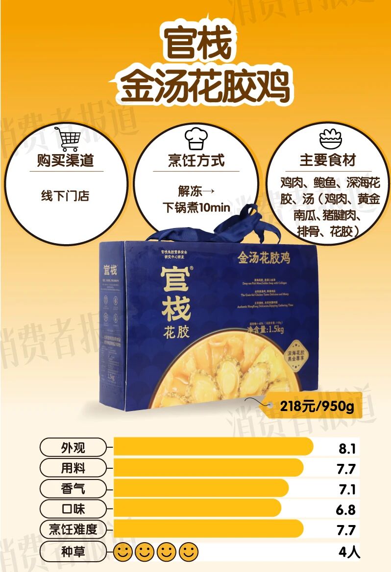 妙音咪子认为,“汤色金黄诱人,汤汁浓稠,花胶厚实软滑。加热简单,能轻松享用到一道用料讲究的广式硬菜”;而张无技、嘻嘻则觉得,“鸡味过重,偏腥、偏咸”,不过,他们一致认可其用料扎实,表示“胜在有鲍鱼”“色相不错,用料也很好,有鸡肉、鲍鱼和花胶”;杨M也认为“汤汁颇为下饭”。